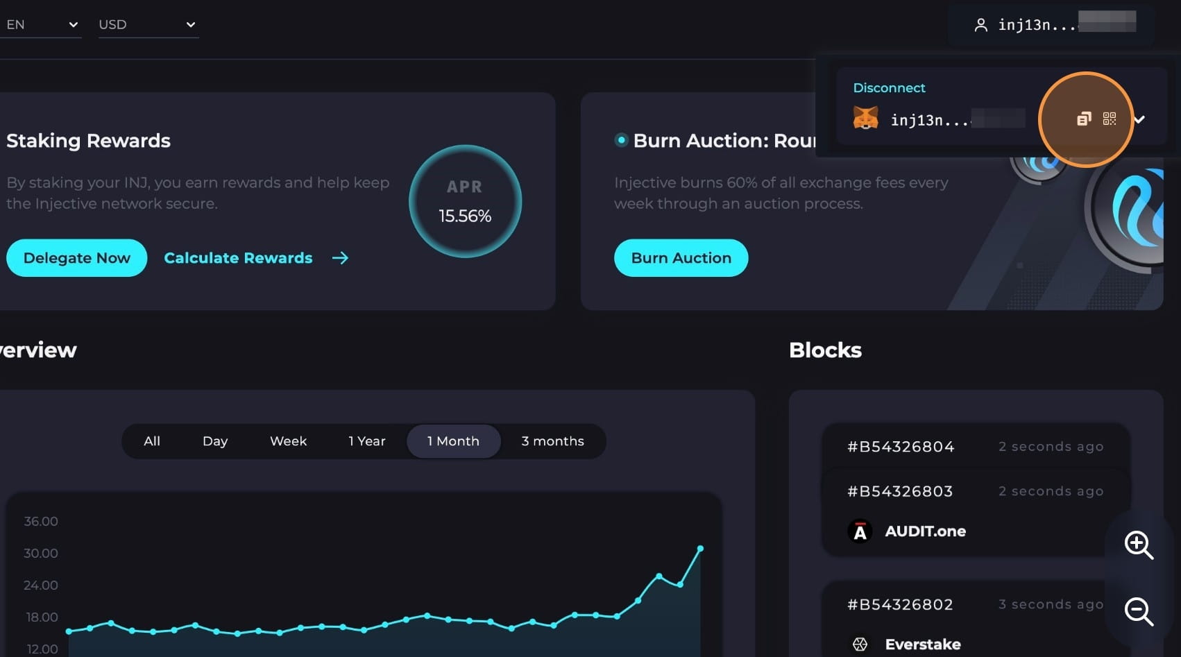 Jakmile se připojíte, najeďte myší na adresu své peněženky Injective