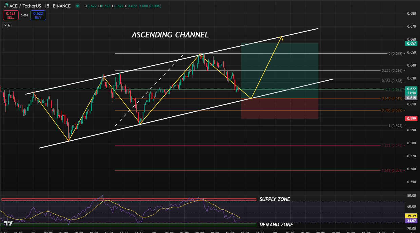 Na 15minutovém časovém rámci ACE vytváří rostoucí kanál a nedávno testoval horní trendovou čáru. Nyní se zdá, že se vrací směrem k dolní hranici kanálu. Pokud ACE dodrží úroveň 0,618 Fibonacciho retracementu a najde podporu podél dolní trendové čáry kanálu, je pravděpodobné, že dojde k býčímu pokračování. Kromě toho se RSI drží v zóně poptávky, což naznačuje silný zájem o nákup v této oblasti. Na základě této konfluence zůstávám v krátkodobém horizontu býčí na ACE.