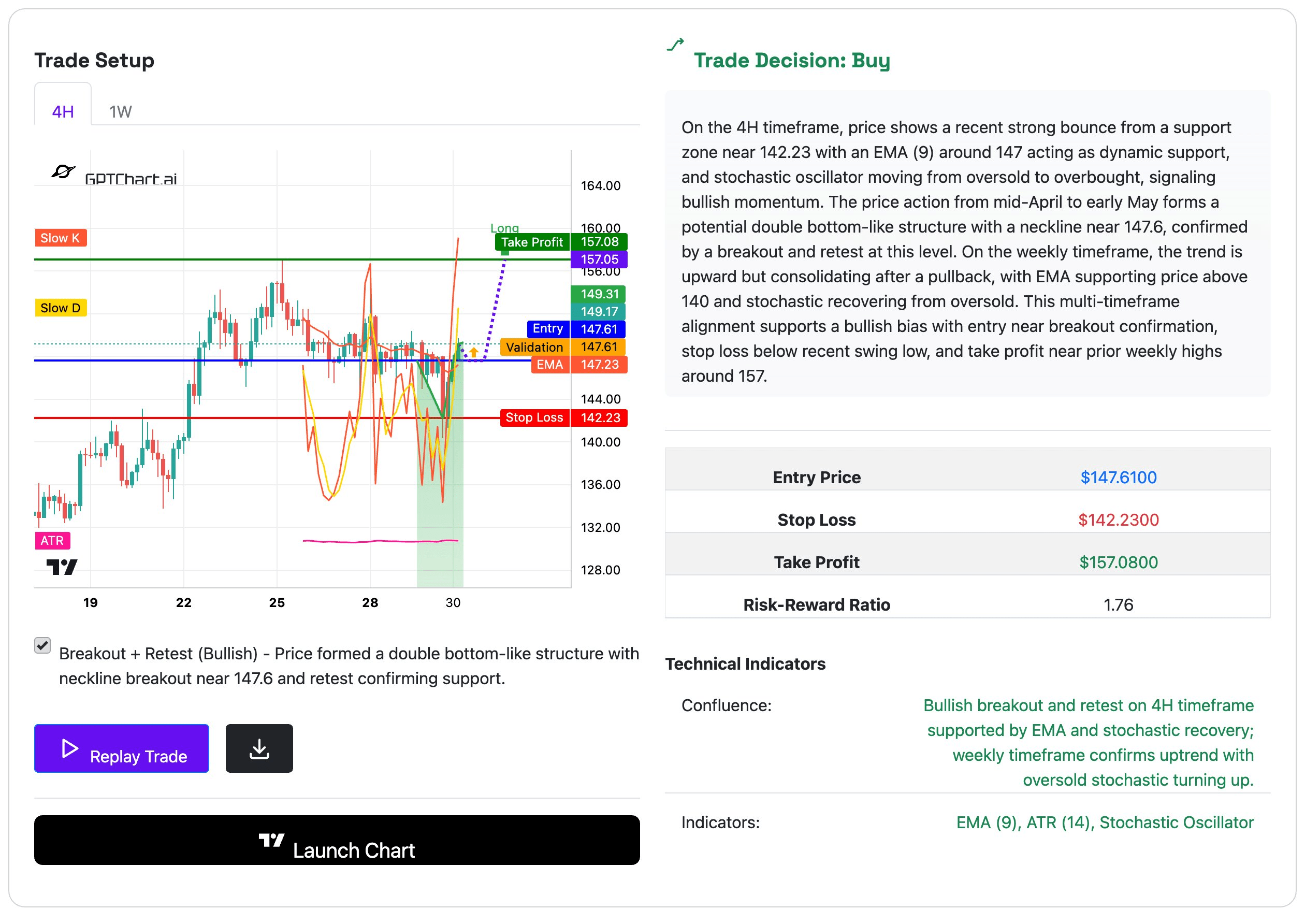 Obchodní rozhodnutí: KUPUJ Na 4H časovém rámci cena ukazuje nedávný silný odraz z podpůrné zóny poblíž 142,23 s EMA (9) kolem 147, která funguje jako dynamická podpora, a stochastický oscilátor se pohybuje z přeprodaného do překoupeného stavu, což signalizuje býčí momentum. Cena od poloviny dubna do začátku května tvoří potenciální strukturu dvojitého dna s linií krku poblíž 147,6, potvrzenou průlomem a testem na této úrovni. Na týdenním časovém rámci je trend vzestupný, ale konsoliduje po návratu, přičemž EMA podporuje cenu nad 140 a stochastický oscilátor se zotavuje z přeprodaného stavu. Toto vícerozměrné zarovnání podporuje býčí náklon s vstupem poblíž potvrzení průlomu, stop loss pod nedávným swing low a take profit poblíž předchozích týdenních maxim kolem 157.