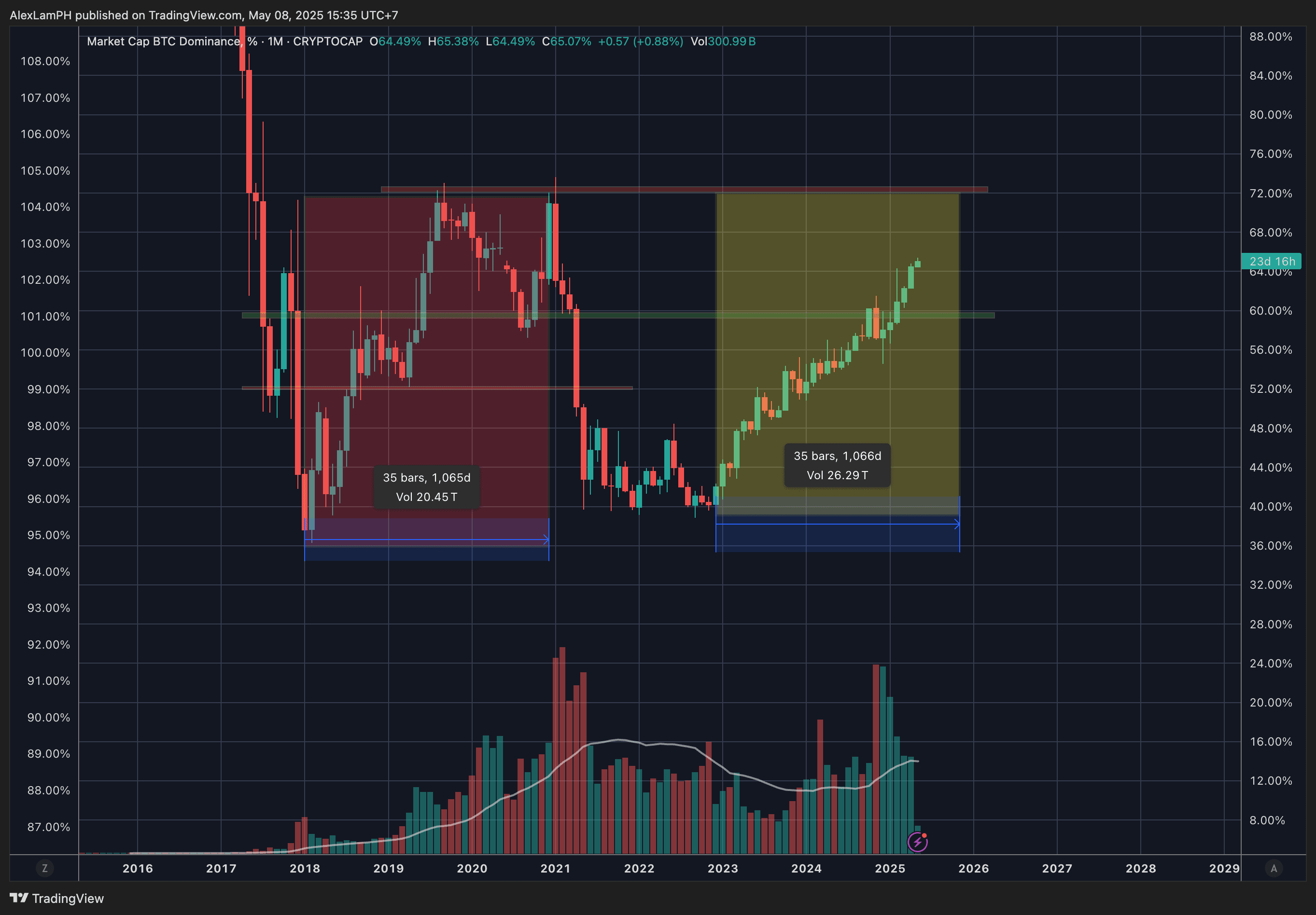 Právě teď Bitcoin Dominance vzrostla přesně na 1 066 dní — téměř dokonale odpovídá předchozímu cyklu.