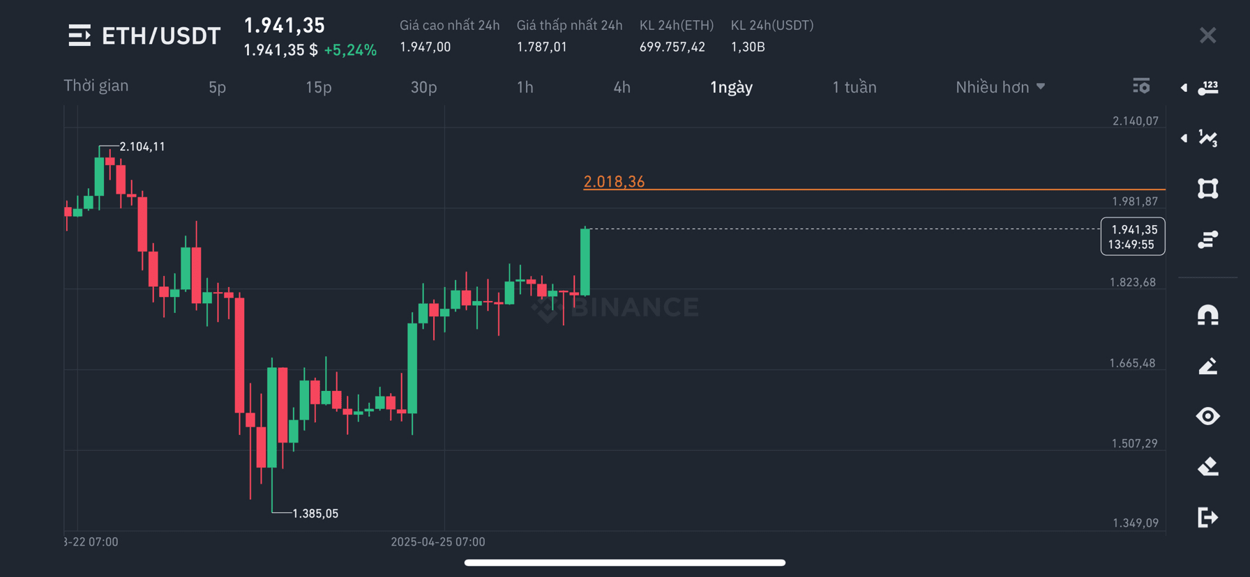 🔴 Aktuální cena ETH je přibližně 1940 - nárůst téměř 9%. Úroveň, na kterou je třeba dávat pozor, je 2000.