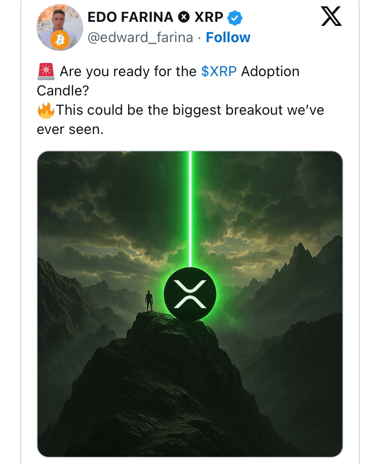 V nedávném příspěvku na X Farina připravil mysl XRP zastánců na to, co nazval 'svíčkou přijetí XRP.' Doprovodný obrázek to zobrazuje jako dlouhou zelenou svíčku na maskotu XRP, který vystřeluje do nebe.