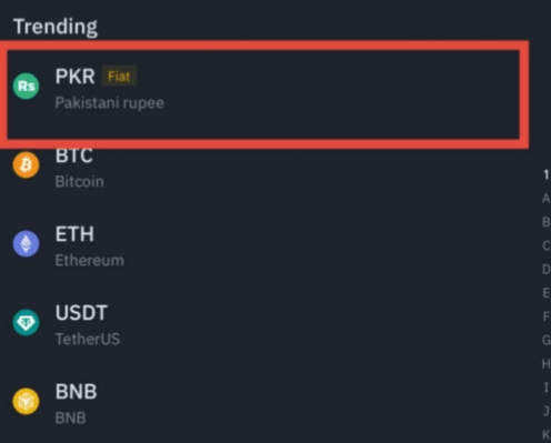 3. Vyberte fiat a zvolte svou měnu (např. USD, PKR).