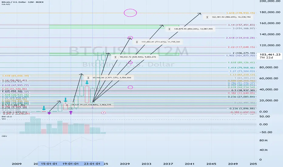 Na základě 12M BTCUSDT grafu a Fibonacciho rozšíření jsou to klíčové cíle pro růst a potenciální odporové zóny: