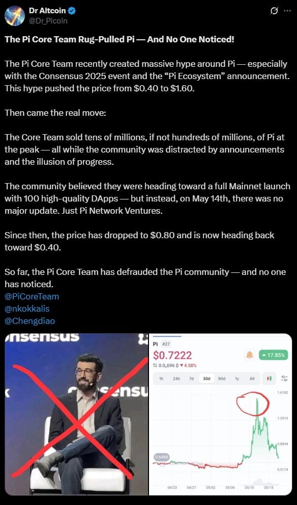 Jak cena klesá zpět na 0,80 $ a může klesnout ještě více, Dr. Altcoin varuje, že by to mohlo být jedním z nejsofistikovanějších podvodů v historii kryptoměn, pokud je to pravda 😱. Jádrový tým Pi zatím nereagoval — ale pokud jsou obvinění pravdivá, tisíce uživatelů mohly být uvedeny v omyl v učebnicovém příkladu vnitřní manipulace. 💔📉 Toto je výzva k probuzení pro všechny investory do kryptoměn: Nenechte se nachytat na hype bez skutečného pokroku! ⚠️🔍