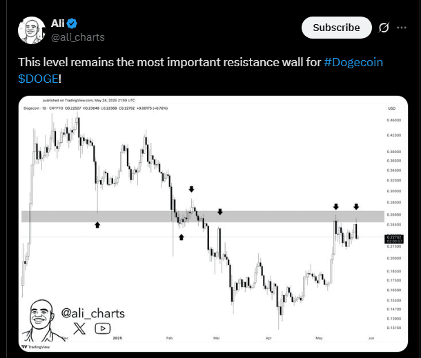 Cena se snažila překonat 0,25 USD navzdory několika pokusům. Nedávná analýza zdůrazňuje, že tento práh je klíčový pro potvrzení potenciálního vzestupu. Selhání v překonání udrželo Dogecoin pod medvědím tlakem, přičemž jeho hodnota se pohybuje blízko dolní hranice jeho aktuálního rozmezí.