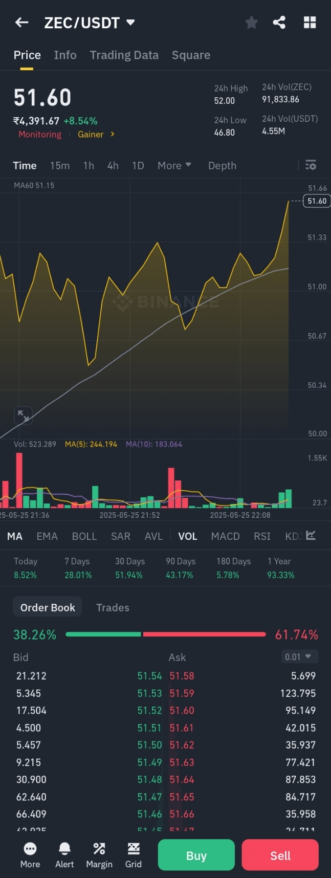 K 26. květnu 2025 se Zcash (ZEC) obchoduje za $51.45 USDT, s intradenním maximem $51.45 a minimem $47.19.