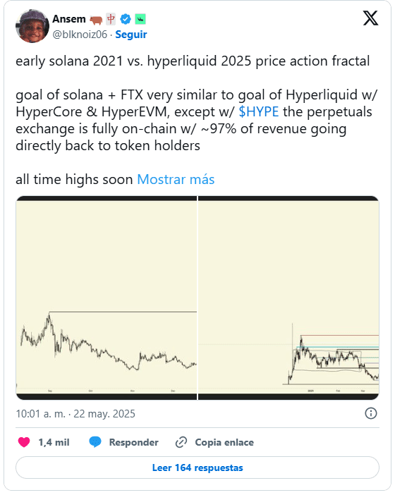 «Fraktál akce ceny Solany 2021 vs. Hyperliquid 2025. Cíl Solany + FTX je velmi podobný cíli Hyperliquid s HyperCore a HyperEVM, s tím rozdílem, že s $HYPE je perpetuální výměna zcela na řetězci a přibližně 97% příjmů.»