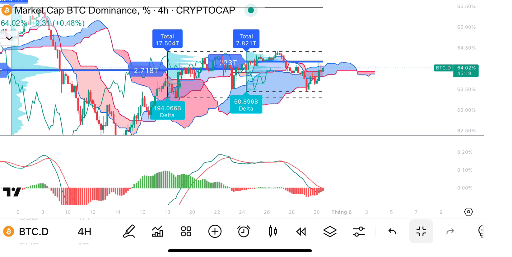 ✅ Pokud BTC.D překročí 64,20 % rozhodně → kapitál se silně vrací k BTC → Altcoin dostává zásah.