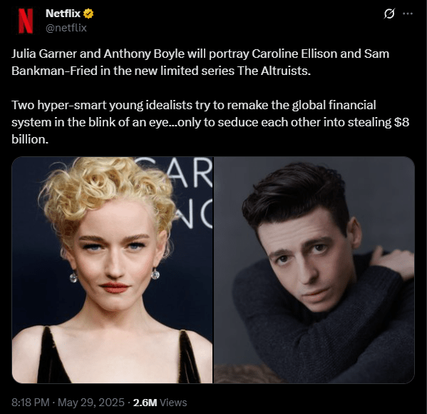 Netflix se pouští do nového dramatického projektu inspirovaného pádem kryptoměnového giganta FTX. Nadcházející osmidílný seriál s názvem „Antisociální síť: Altruista“ představí Anthonyho Boylea jako Sama Bankmana-Frieda a Julii Garner jako Caroline Ellison v hlavních rolích.