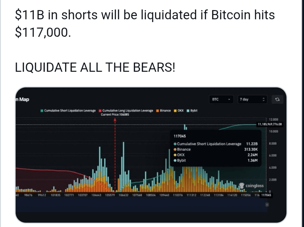 11 miliard dolarů v short pozicích čelí likvidaci při 117K Bitcoinu