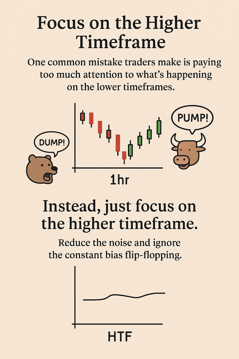Jednou z největších chyb, které dělají noví a dokonce i zkušení obchodníci, je posedlost nižšími časovými rámci—neustále měnící jejich zaujatost na základě každé 15minutové nebo 1hodinové svíčky.