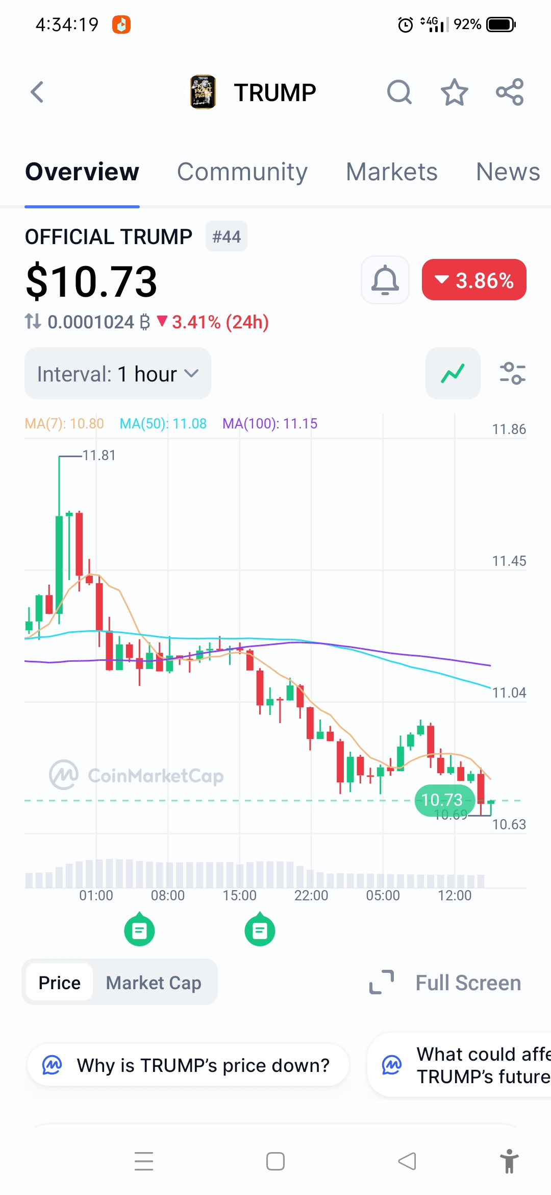 Aktuální cena: Přibližně $TRUMP $10,73 USD, což odráží pokles o 3,9 % za posledních 24 hodin.
