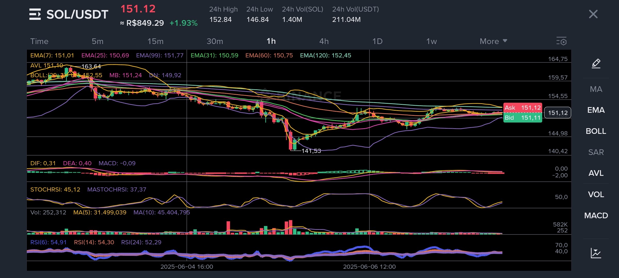 EMA(7) = 151,01 | EMA(25) = 150,69 | EMA(99) = 151,77 | EMA(120) = 152,45
