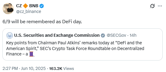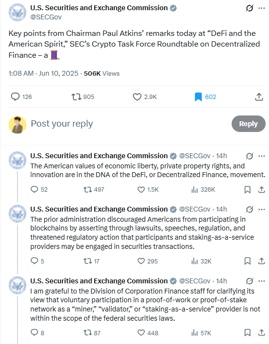 Předseda SEC Paul Atkins pronesl projev na panelové diskusi "DeFi a americký duch" dne 10.06.2025, tyto výroky mají revoluční význam pro DeFi v nadcházející době, mnoho tokenů souvisejících s DeFi tvoří pilíř.