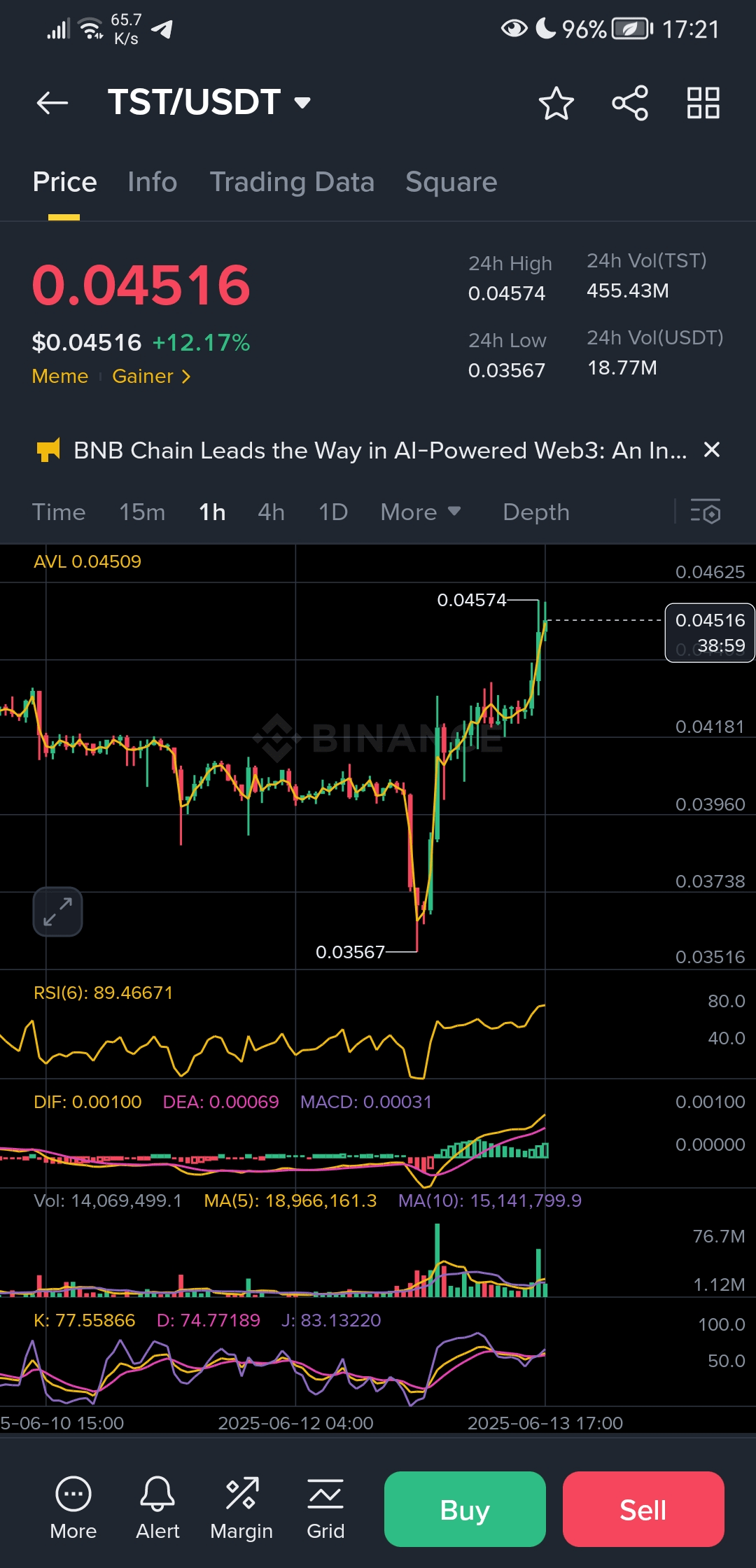 ✅ Horký odraz! Po poklesu na $0.03567 zaznamenal TST prudký vzestup na $0.04574, což představuje nárůst přes +12% během 24 hodin! Silný signál obnovení důvěry a nákupního momentum.