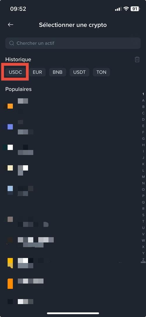 Vyberte kryptoměnu, kterou chcete přijmout (např. USDC)