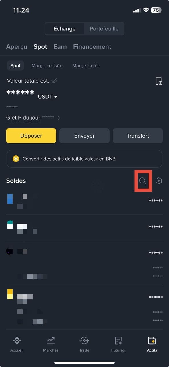 Otevřete svou aplikaci Binance a přejděte do své Spot nebo Finanční peněženky, poté klikněte na ikonu hledání