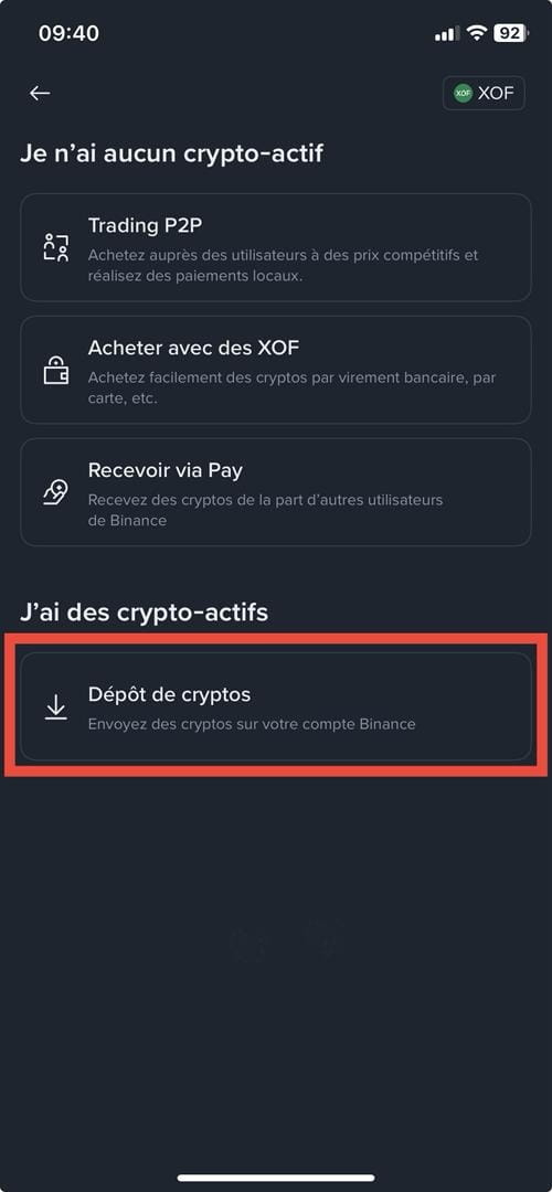 Vyberte způsob, jakým chcete přijímat kryptoměny. Pokud nemáte kryptoměnu na jiné platformě, můžete si ji koupit přes Trading P2P nebo zakoupit s fiat měnou (přímý nákup) nebo přijmout přes Pay (od jiného uživatele Binance, kterého znáte). Pokud chcete přijmout kryptoměnu z jiné platformy, jako je Coinbase, vyberte Vklad kryptoměn