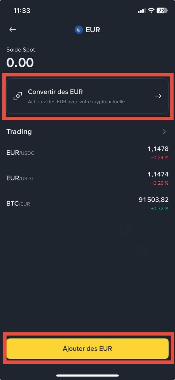 Pokud máte na svém účtu Binance kryptoměny, můžete je převést na EUR, ale musíte se ujistit, že máte jednu z kryptoměn, které jsou zahrnuty do obchodních párů dostupných pro EUR. V takovém případě vyberte Převést na EUR a poté budete následovat pokyny zobrazené na obrazovce. Jinak klikněte na Přidat EUR