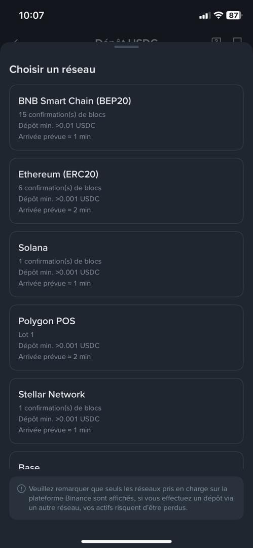 Uvidíte dostupné sítě pro vklad USDC na Binance. Prosím, pečlivě si vyberte a zejména se ujistěte, že zvolená síť je stejná jako síť platformy, ze které vybíráte prostředky. Pokud vyberete špatnou síť, vaše prostředky mohou být ztraceny a nebudou obnovitelné.