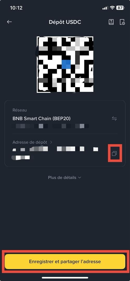 Uvidíte QR kód a adresu vkladu sítě, kterou jste zvolili. Stiskněte ikonu Kopírovat pro zkopírování adresy vkladu, poté ji vložte do pole adresy platformy, ze které chcete kryptoměny vybrat. Můžete také stisknout [Uložit a sdílet adresu], abyste uložili QR kód a importovali ho přímo na platformu pro výběr.