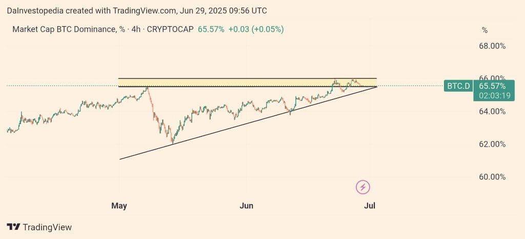 Dominance Bitcoinu ($BTC.D) právě odmítla majoritní rezistenci, ale stále se drží nad zónou breakout vzestupného trojúhelníku — klíčový bod pro BTC i širší trh s altcoiny.