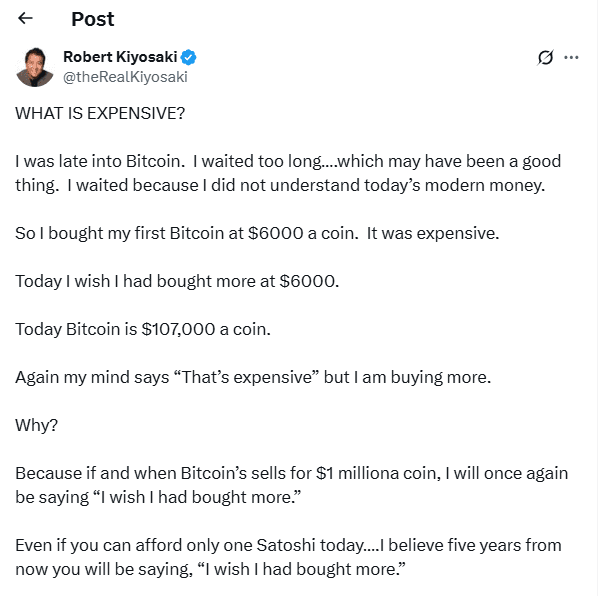V současnosti se obchoduje kolem 107 000 - 107 580 dolarů. Kiyosaki řekl, že jeho pomalý začátek byl způsoben tím, že tehdy plně nerozuměl digitálním penězům.