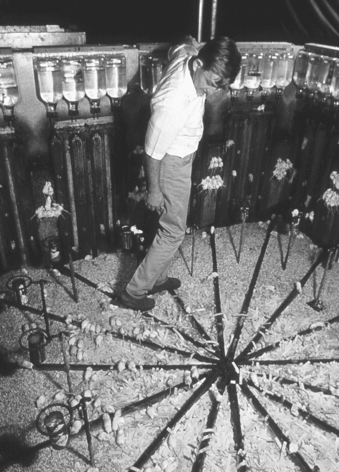 V roce 1968 provedl etolog John Calhoun, který pracoval v Americkém národním institutu duševního zdraví, impozantní studii. Čerpal paralely mezi myší a lidskou společností, snažil se předpovědět budoucnost lidstva na základě tohoto srovnání. Pro svůj experiment Calhoun vytvořil takzvaný "ráj" pro bílé myši. V laboratorním prostředí byla postavena čtvercová ohrada o rozměrech 2 m na 2 m a výšce 1,5 m, ze které se myši nemohly dostat ven. Ohrada byla udržována při pohodlné teplotě, bylo dostatek jídla a vody, a materiály na hnízdění byly neustále přidávány. Hlodavci byli pod neustálým dohledem veterinářů, kteří sledovali jejich zdraví. Byla přijata všechna nezbytná bezpečnostní opatření: nebyli zde predátoři ani nebezpečné infekce. Ohrada byla čištěna jednou týdně a byla dokonale čistá. Tímto způsobem byl vytvořen ideální životní prostor pro myši. Vědec popsal svůj design jako "myší utopii" a experiment nazval "Vesmír-25". Ohrada mohla pojmout až 3 840 myší, ale maximální populace během experimentu dosáhla 2 200 jedinců, po čemž pouze klesla.