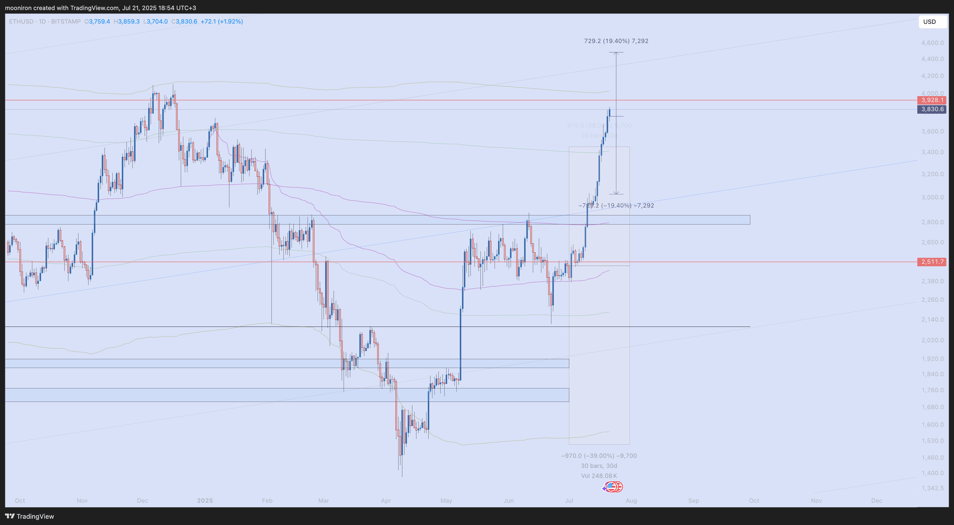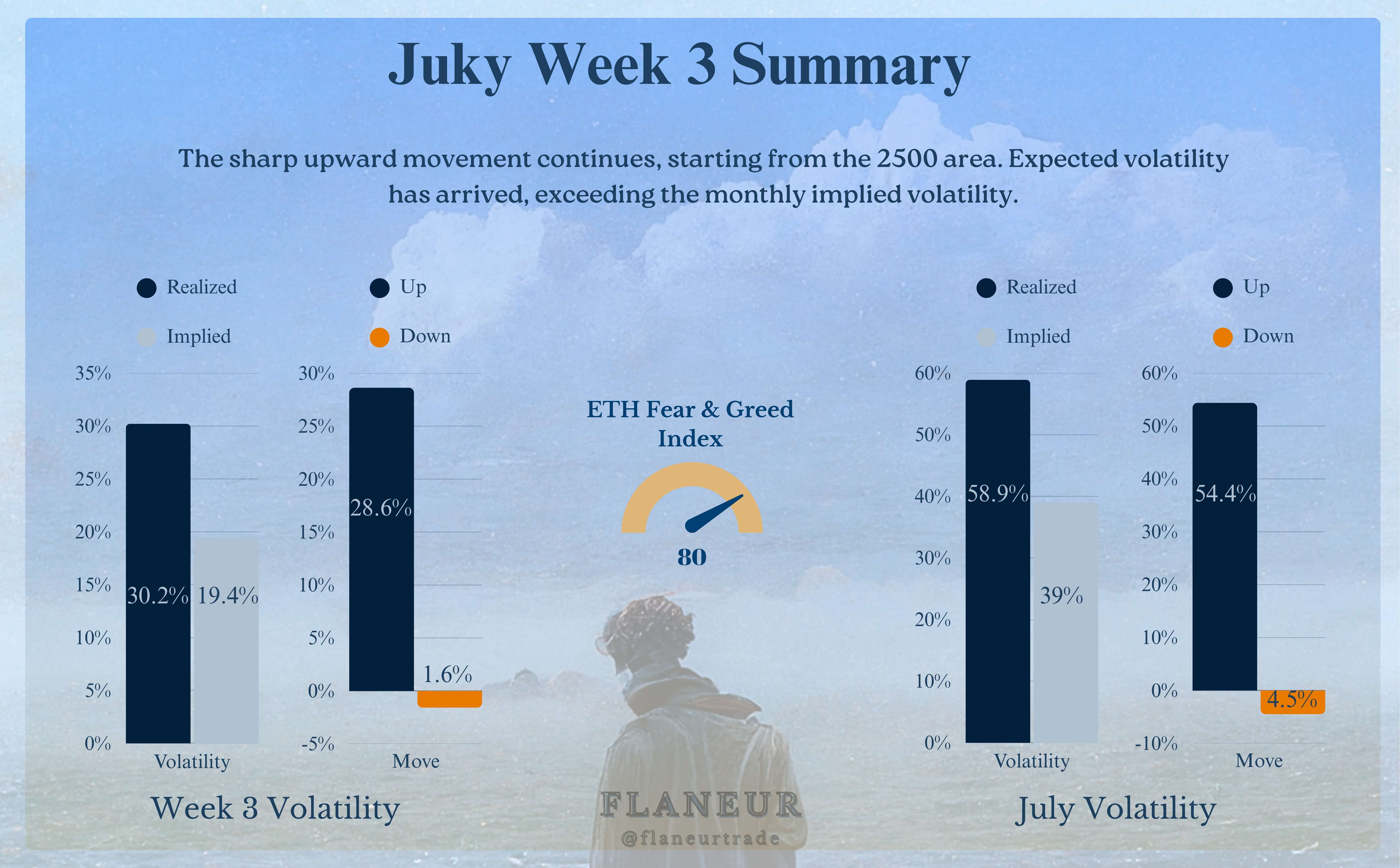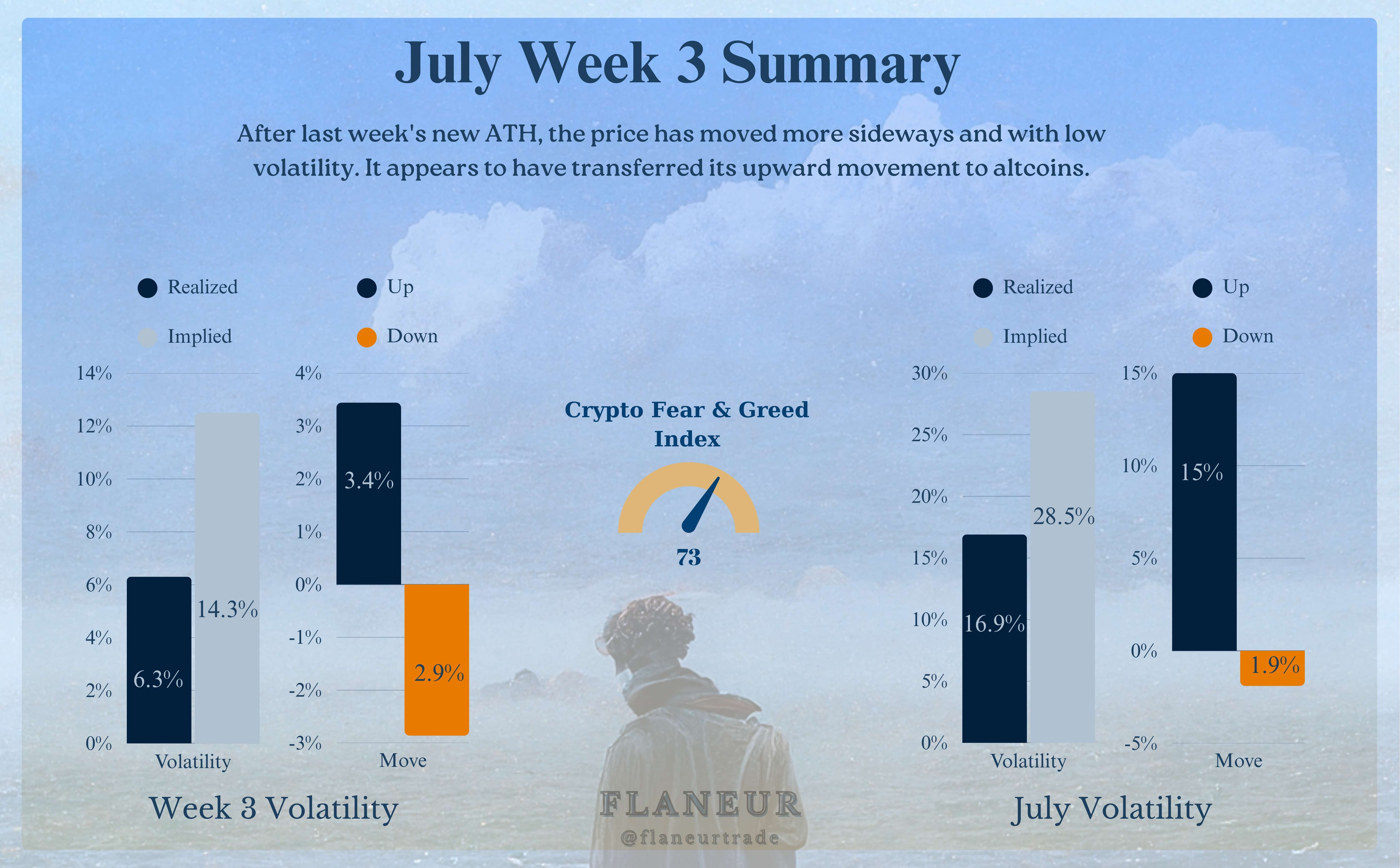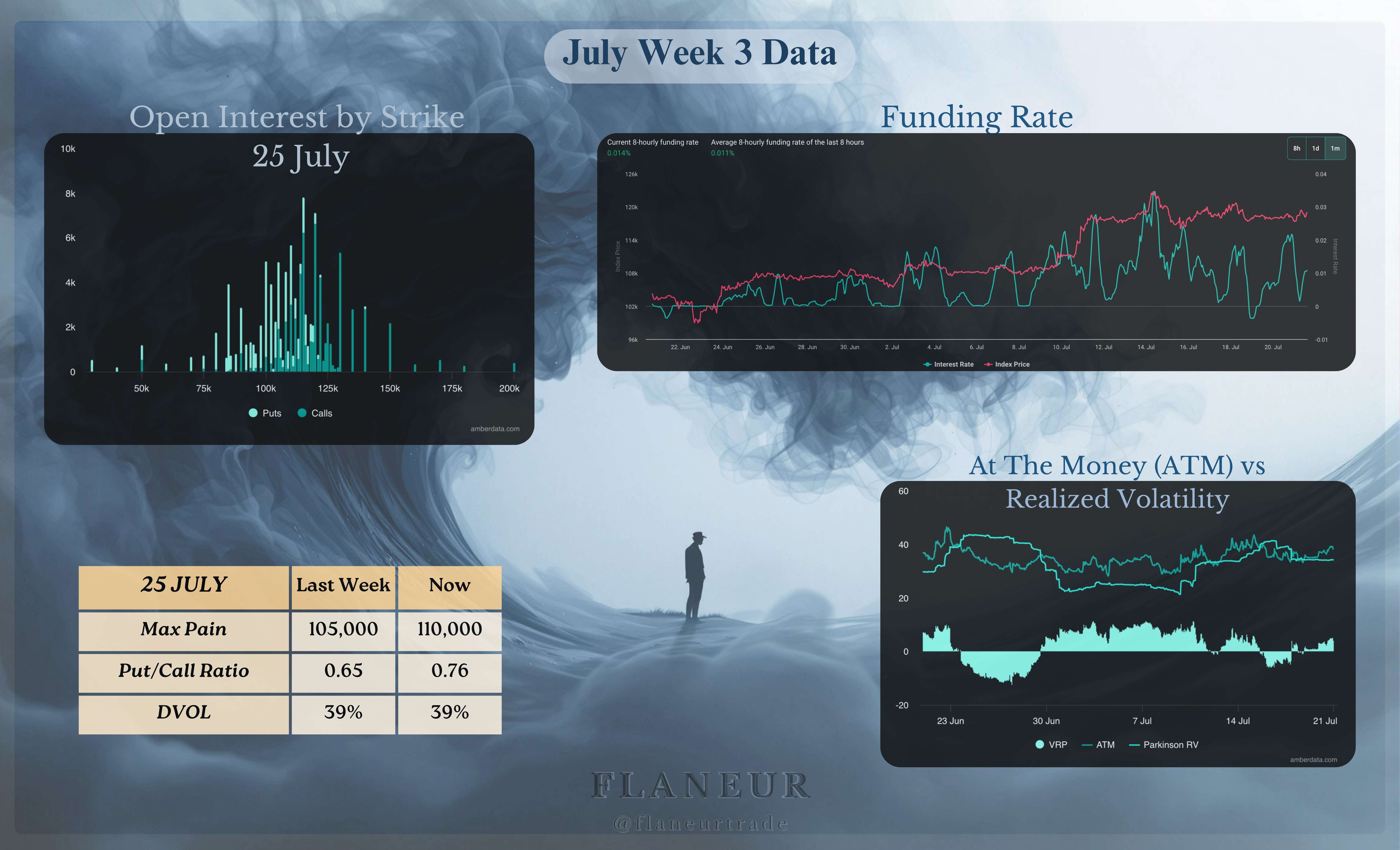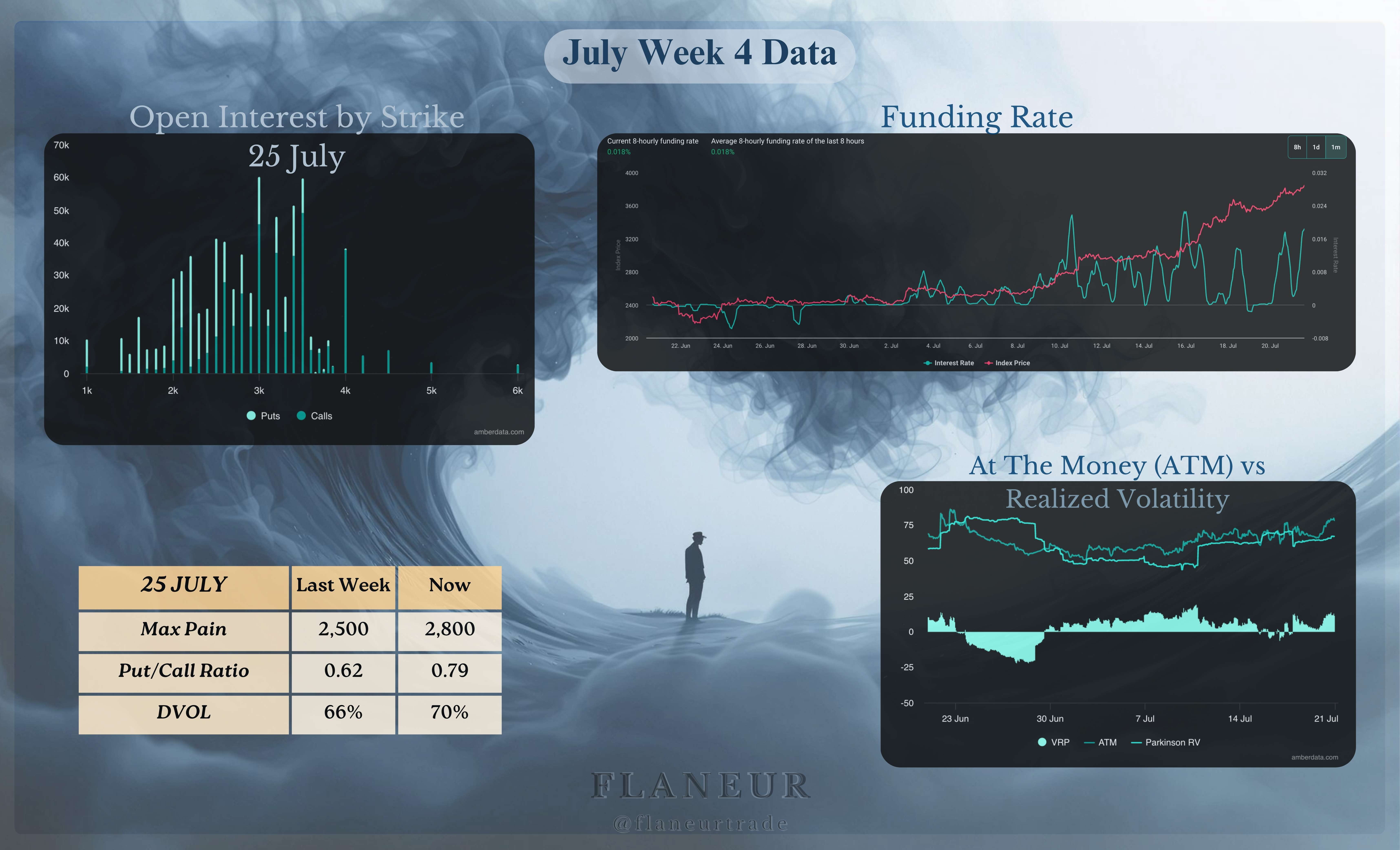Ahoj všichni. Jak vstupujeme do posledního týdne července, uzavřeli jsme předchozí týden s jasnou divergencí na trhu. Zatímco Bitcoin vstoupil do fáze odpočinku s nízkou volatilitou po svém novém maximu, dlouho očekávaný pohyb přišel z Etherea, které zcela dominovalo týdnu. S blížícím se vypršením opcí, pojďme se ponořit a podívat se, co nám data říkají.