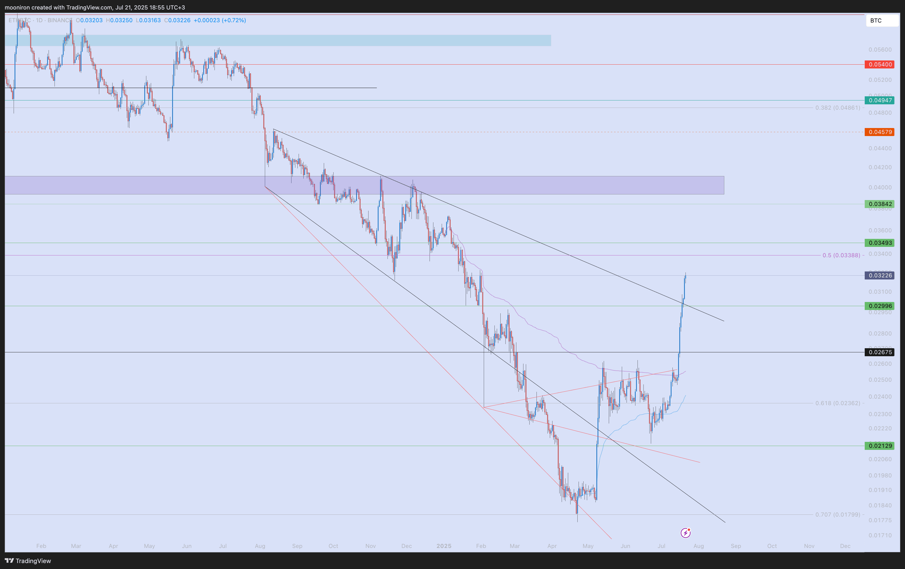 S rally v ETH byly minulý týden prudce prolomeny úrovně odporu 0,026 a 0,030. Nyní můžeme s jistotou říci, že tato oblast je dno. Samozřejmě to neznamená, že nedojde k návratům. Nicméně nyní jsme potvrdili, spolu s technickými ukazateli, že ETH bude silnější. Aby byla tato myšlenka zneplatněna, museli bychom vidět uzavření pod 0,026 a poté 0,023. Jinak jsou naše cíle nahoru v oblasti fialového boxu na 0,04 a zóně 0,049-0,050.