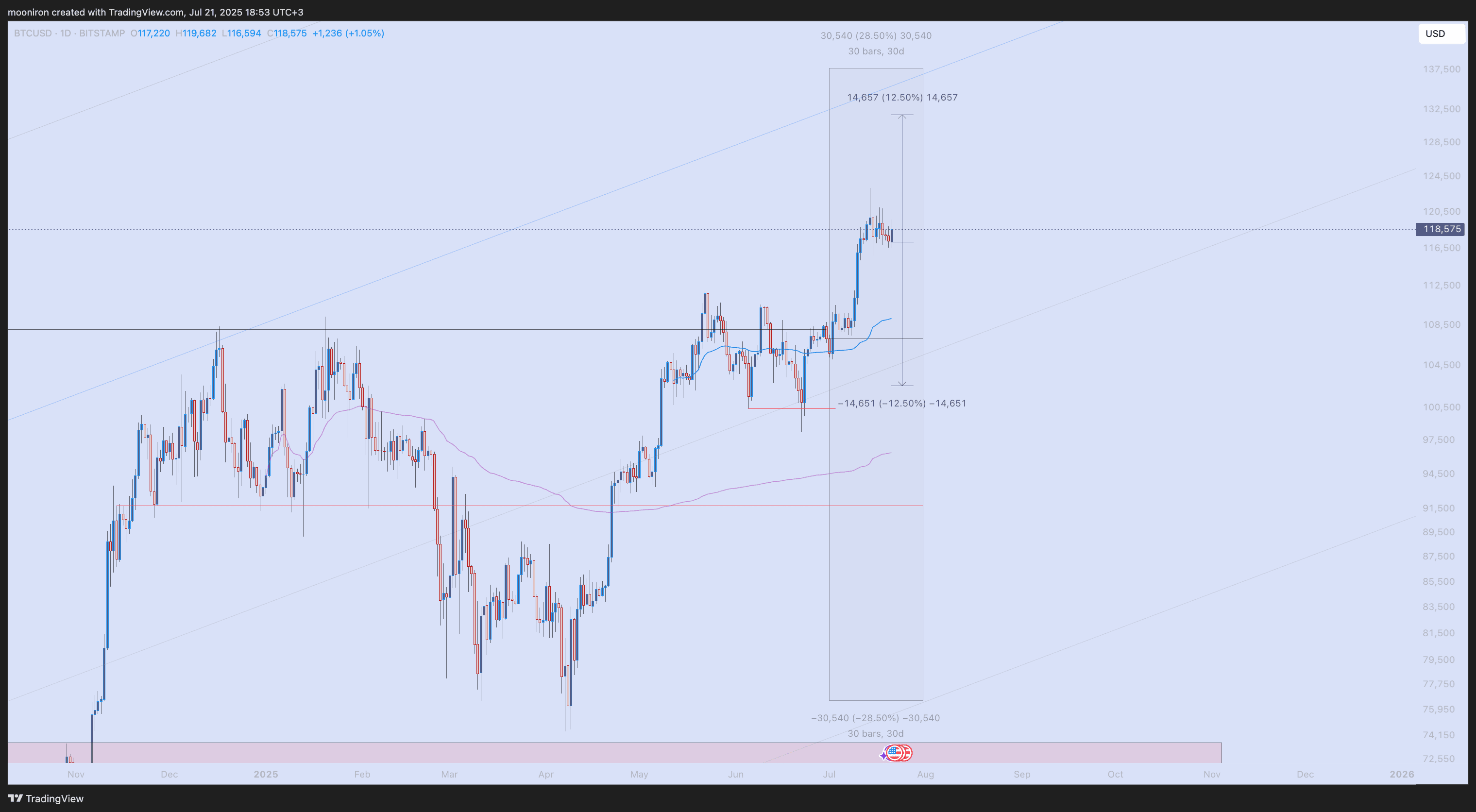 Očekávaný rozsah volatility tohoto týdne (implikovaná volatilita) je mezi 102k USD a 132k USD. Pokud se cena udrží v tomto širokém rozpětí, zejména pokud otestuje dolní podpory, může to být vnímáno jako nákupní příležitost pro další vlnu nahoru.