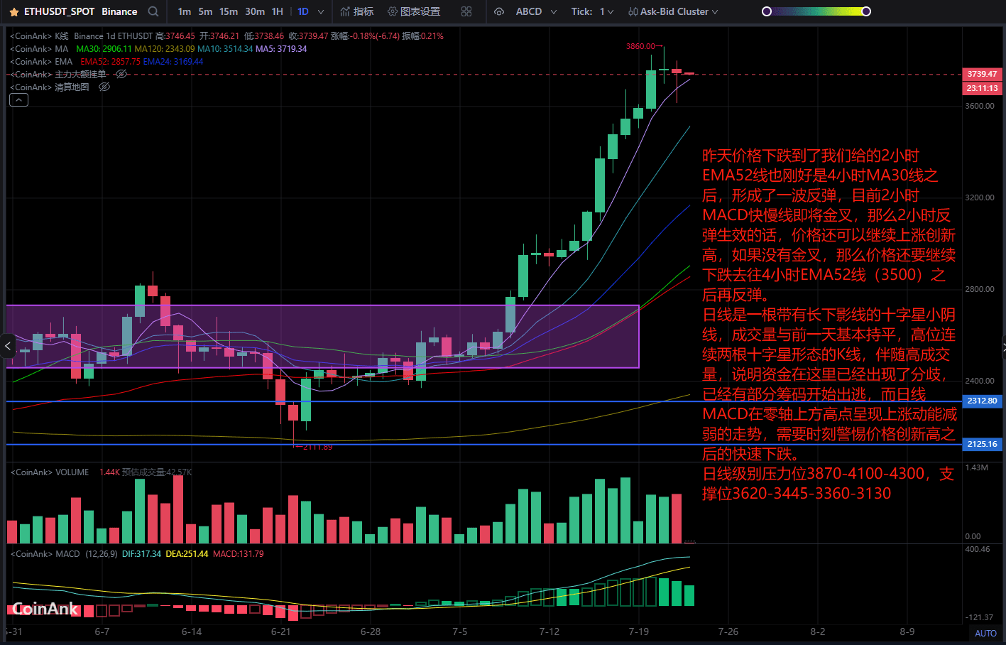 Včera cena klesla na náš 2hodinový EMA52, který je také přesně na 4hodinovém MA30, což vytvořilo odraz. V současnosti se 2hodinová MACD rychlá a pomalá linie chystá na zlatý kříž, takže pokud 2hodinový odraz zafunguje, cena může pokračovat v růstu a dosáhnout nových maxim. Pokud nedojde k zlatému kříži, cena bude muset pokračovat v poklesu k 4hodinovému EMA52 (3500) a poté se odrazit.