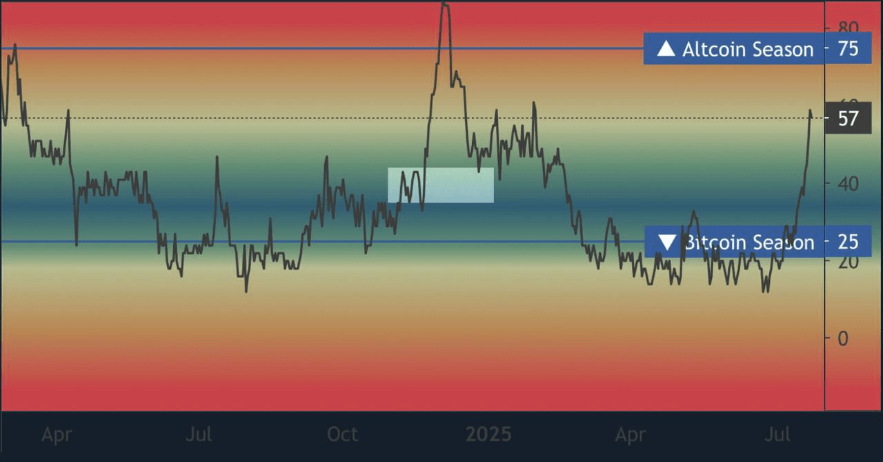 Index sezóny altcoinů právě provedl masivní vertikální pohyb z 25 na 57 — jeden z nejostrých skoků, které jsme viděli za měsíce.