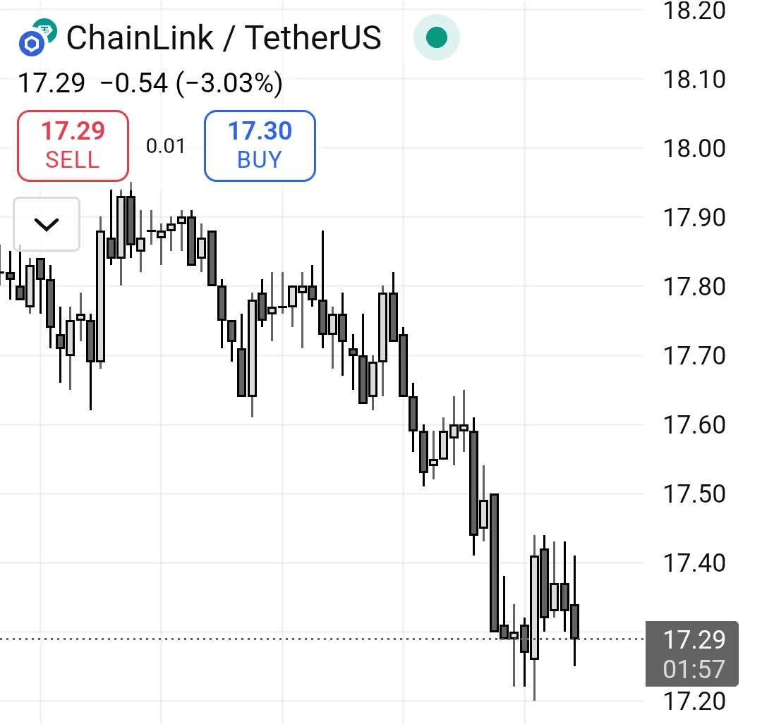 ChainLink se obchoduje za $17.29, dolů -3.03%, po neúspěšném pokusu udržet se nad rezistencí $18.00. Cena vykazuje jasné odmítnutí a nyní testuje klíčovou podporu kolem $17.20–$17.30. Pokud se tato úroveň prolomí, můžeme vidět další pokles.
