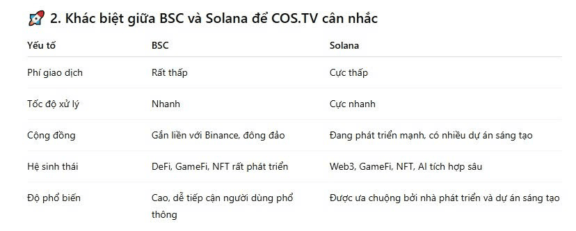 BSC a zejména Solana mají nízké transakční poplatky a vysokou rychlost, což je vhodné pro platformy obsahu, které potřebují zpracovávat mnoho malých transakcí (mikro-transakce) jako COS.TV.