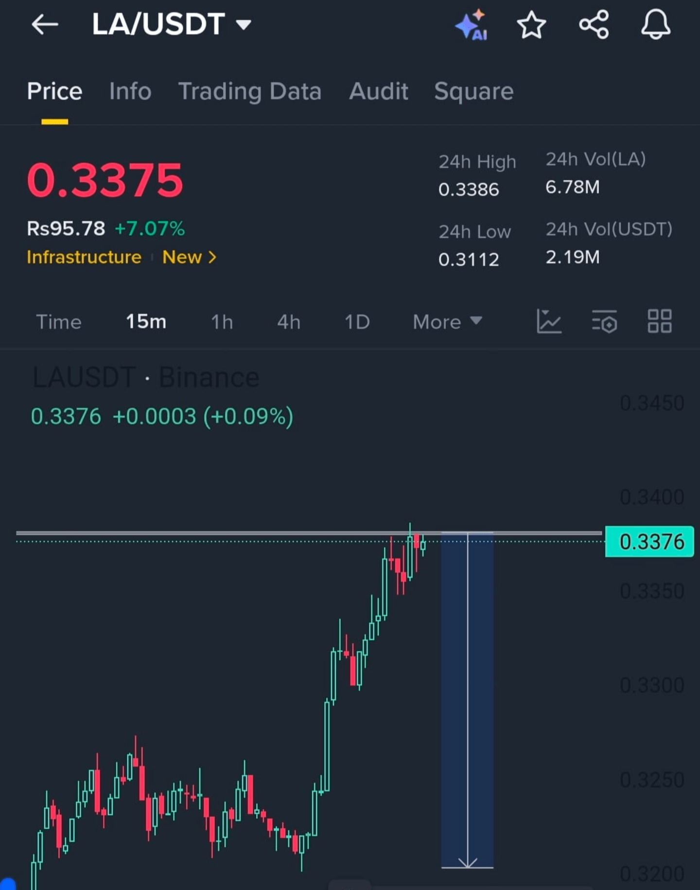 $LA čelí opakovanému odmítnutí na 0.3386, ukazuje, že kupující ztrácejí sílu. Prodejní tlak roste a pokles pod 0.3350 by mohl spustit rychlý pohyb dolů k podpoře.