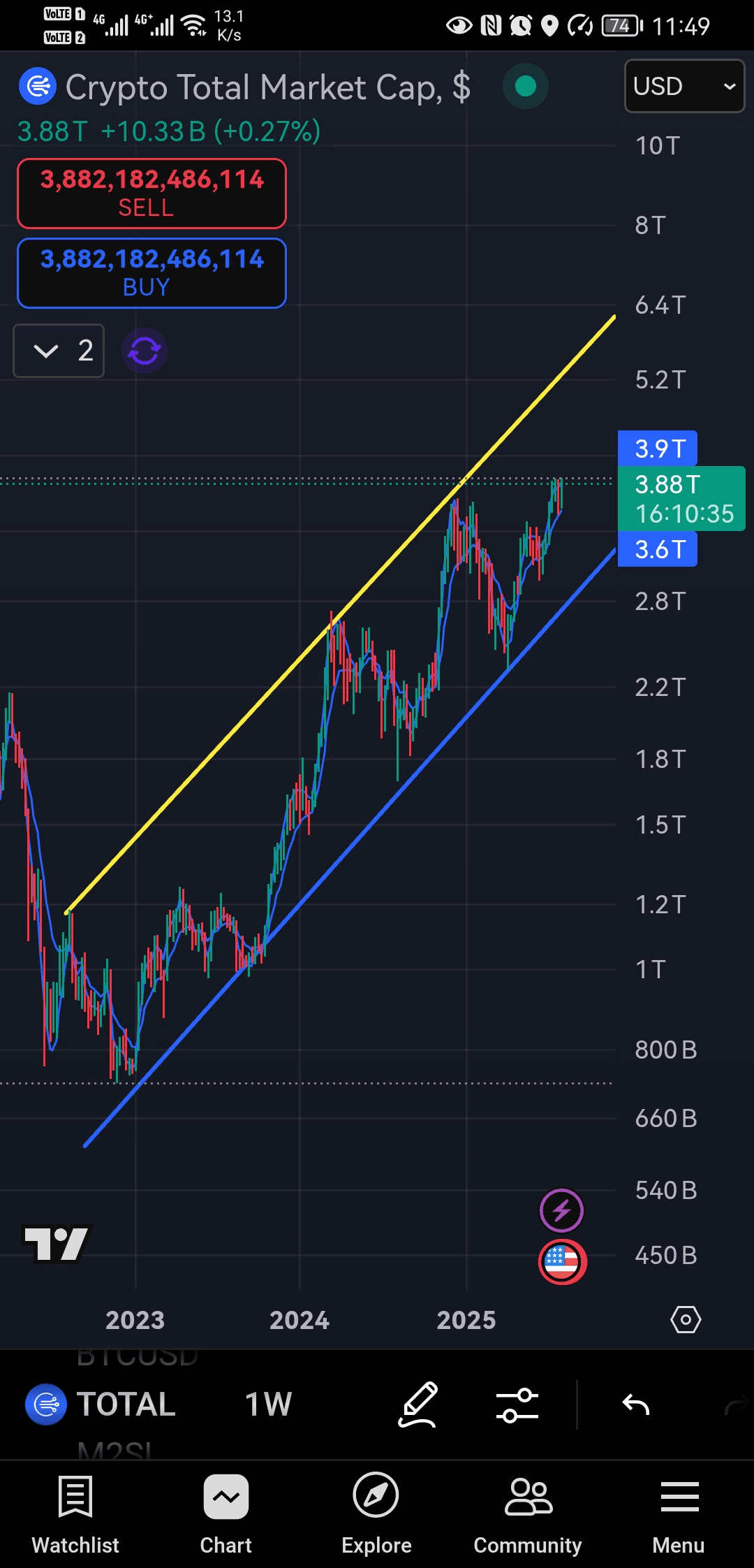 Celková tržní kapitalizace kryptoměn se pohybuje v silném vzestupném kanálu, přičemž Bitcoin již prolomil hranici 100K USD a obchoduje se blízko 117K USD. Ethereum vzrostlo nad 4K USD, podpořeno přílivem ETF a silným nákupním tlakem.