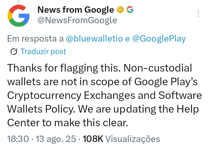 Výše byla zmíněna předpověď o aktualizovaném kontextu: Po backlashi Googlu objasnil, že nekontrolované peněženky (self-custody) nevyžadují licence v Obchodě Play, aktualizujíc Centrum nápovědy.