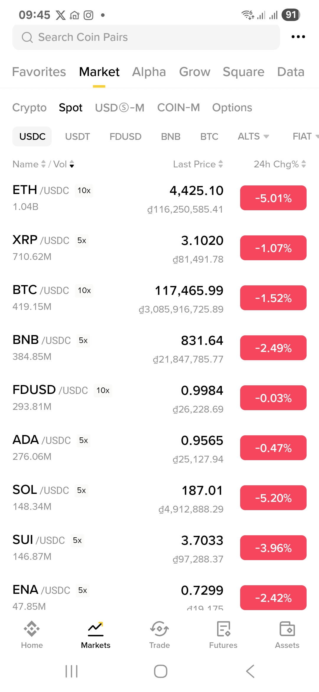 Na základě poskytnutého obrázku je jasné, že kryptoměnový trh dnes zažívá pokles, přičemž většina hlavních aktiv vykazuje negativní procenta změny za posledních 24 hodin.