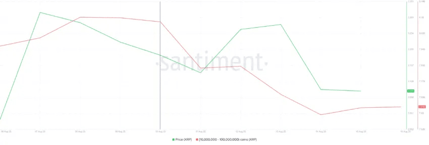 Během minulého týdne prodaly obchodní adresy, které vlastní mezi 10 a 100 miliony XRP, přibližně 400 milionů tokenů v hodnotě odhadovaných 1,2 miliardy USD. Tento objem likvidace vyvinul na trh velký tlak, což přispělo k nedávným výkyvům.