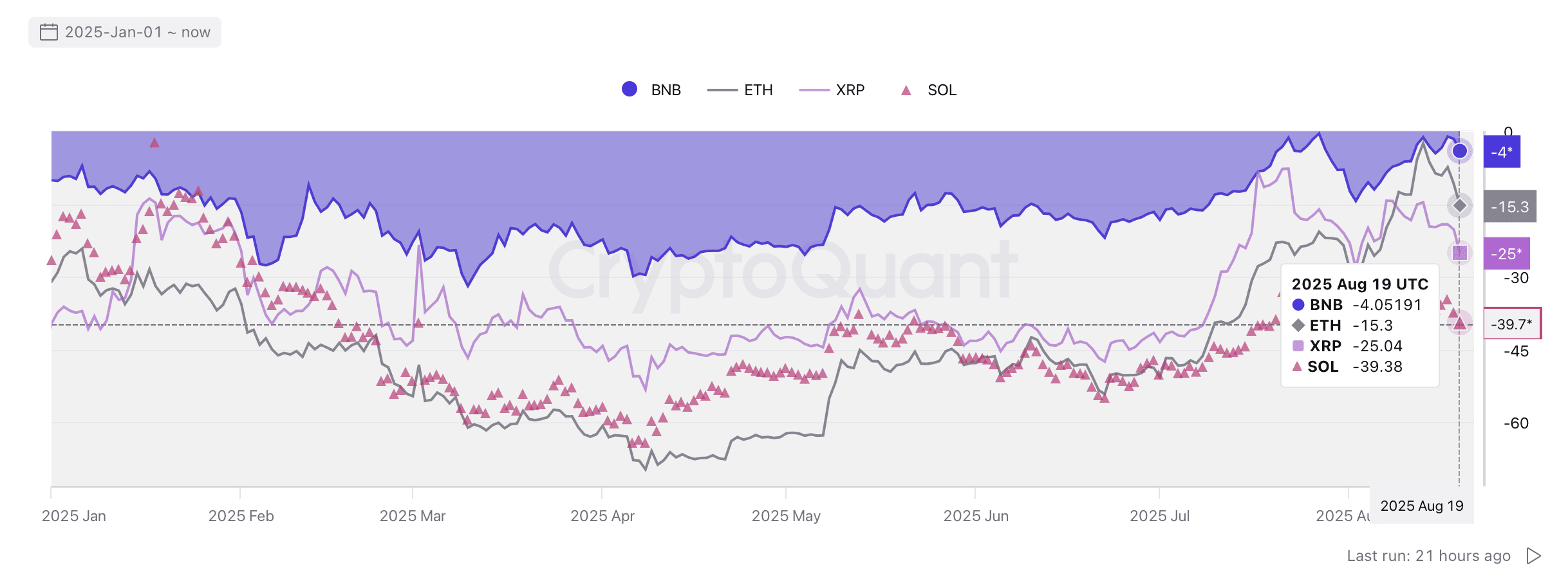 BNB jako jeden z prvních altcoinů se vrátil k novým ATH, předbíhajíc například XRP, SOL či TRX – ostatní projekty stále konsolidují nebo neobnovily hodnotu z roku 2021. Na rozdíl od ETH, ADA či DOGE, které se stále nevrátily na své vrcholy, BNB potvrzuje, že je altcoinem první volby v současném cyklu.
