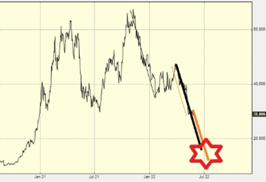 Tento graf vizuálně zachycuje ostrý pokles cen, s vyznačeným „poklesem na dno“—efektivní vizuální reprezentace volatility Bitcoinu.