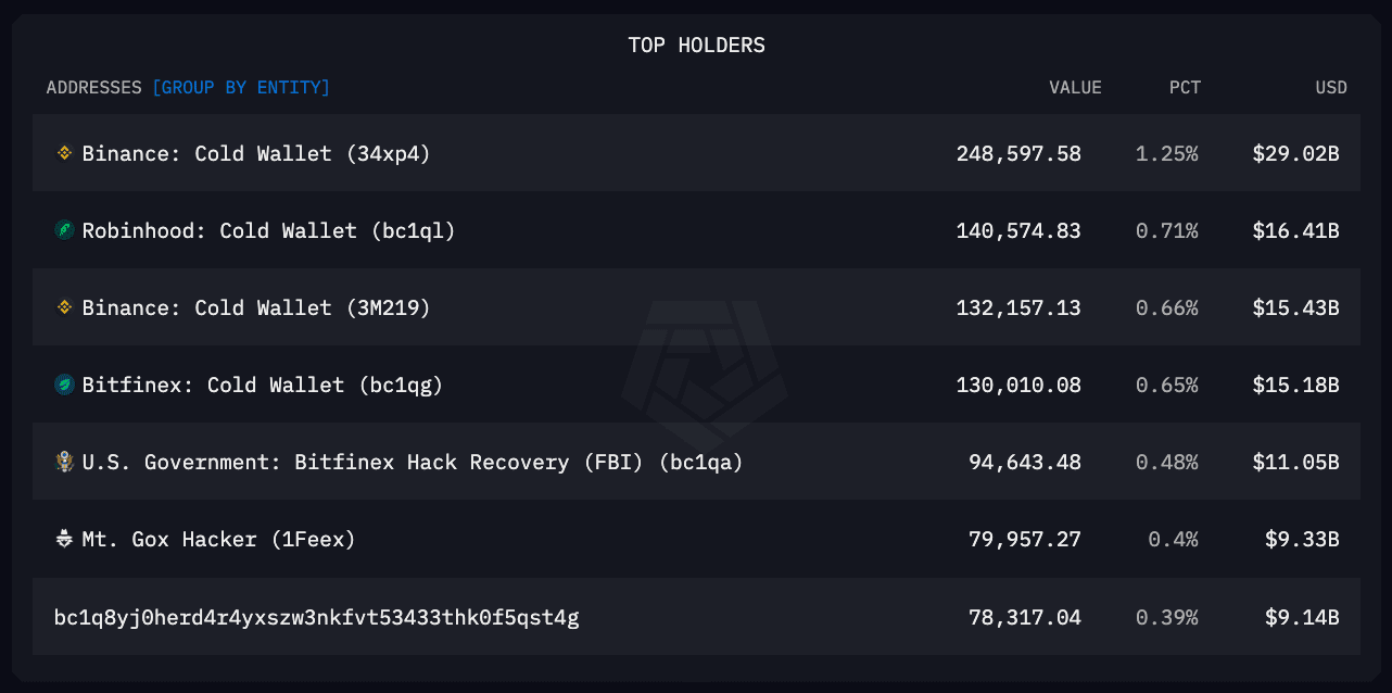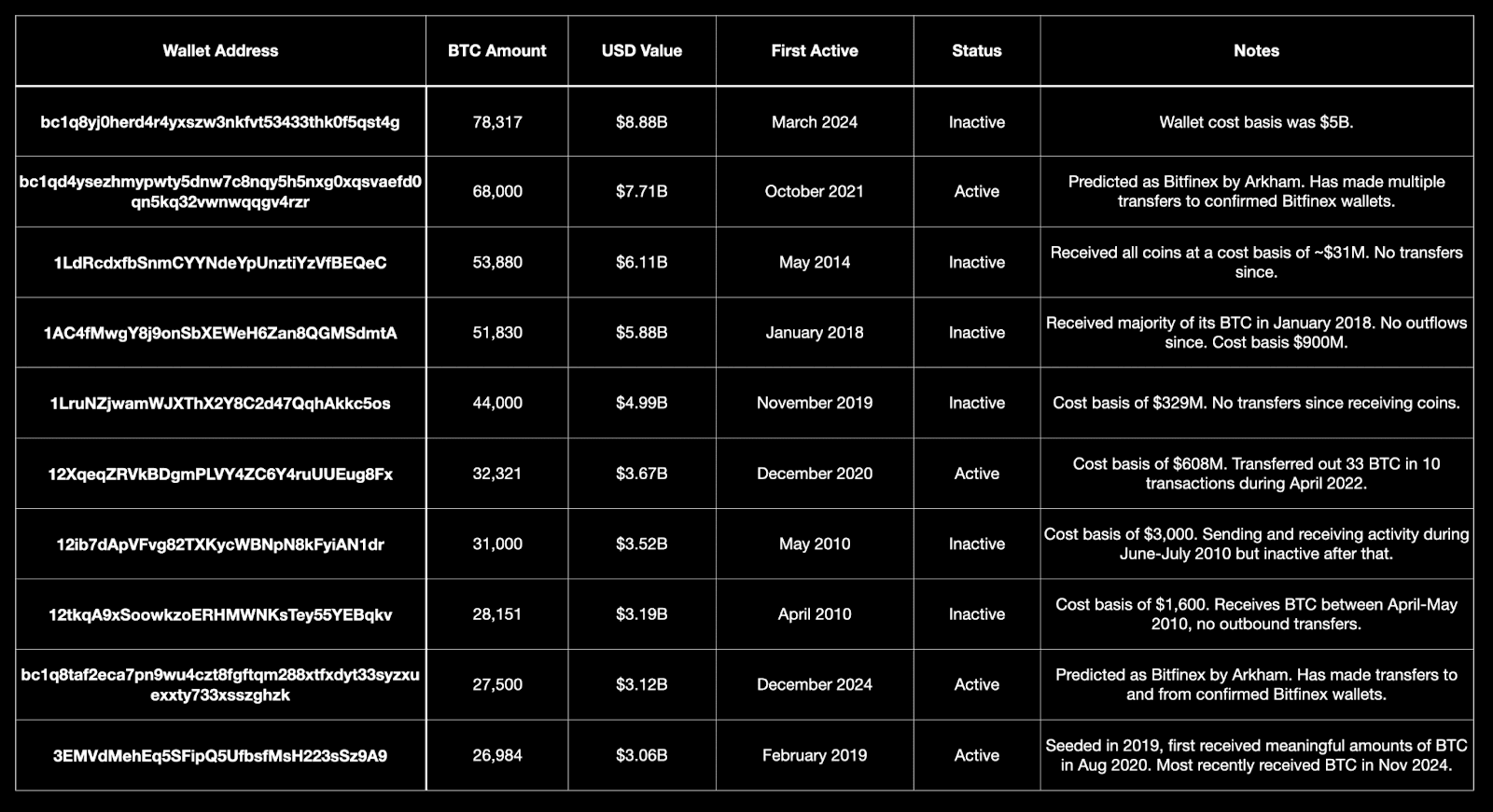 Několik anonymních peněženek drží každá více než 1 miliardu USD v BTC. Mnohé zůstávají nečinné po léta, což vyvolává spekulace o ztracených klíčích nebo neaktivním vlastnictví. Mezi 10 největšími peněženkami velryb jsou šest neaktivní, zatímco čtyři vykazují občasné výběry.