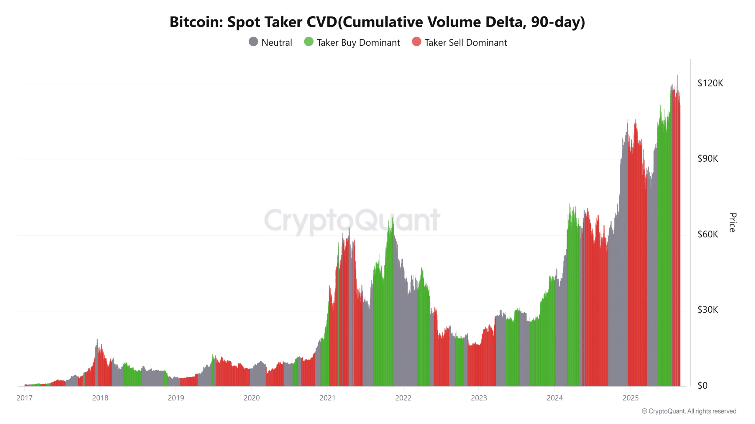 Za posledních 90 dní CVD (čistý objem obchodování) na spotovém trhu vykazuje střídavé ovládání, přičemž nedávné obchodní dny směřují k prodeji. Tento jev naznačuje, že tlak na spotovém trhu je stále velký, a krátkodobý rychlý býčí obrat je obtížně realizovatelný ⚡.