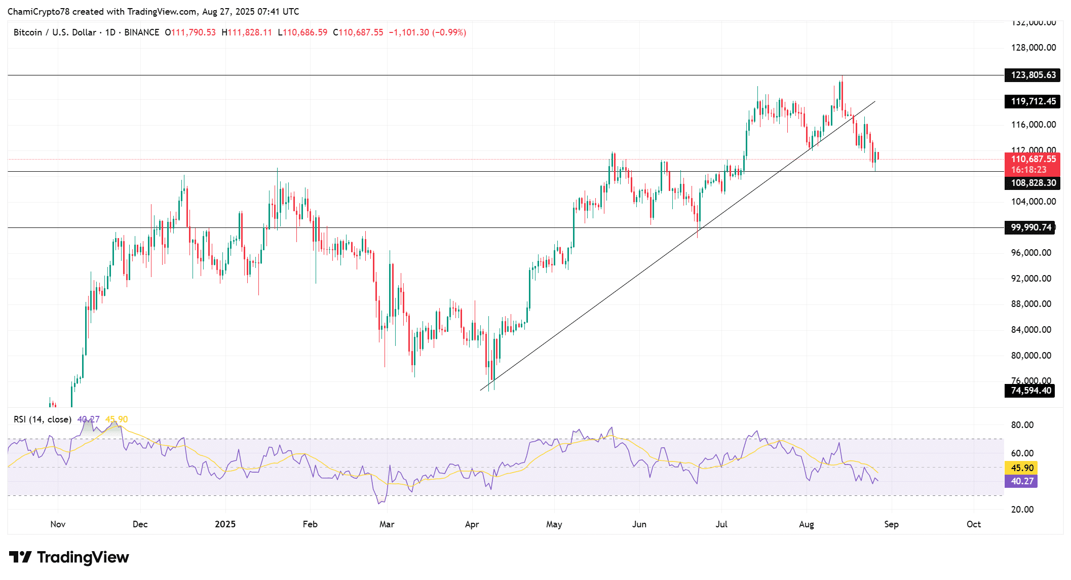 Nejnovější údaje ukazují, že cena bitcoinu klesla na 110 600 dolarů, což prolomilo klíčovou vzestupnou trendovou linii ⛔. Pokud trh nedokáže udržet býčí strukturu, cena může dále klesnout k 108 800 dolarům, nebo dokonce blíž k 100 000 dolarům.
