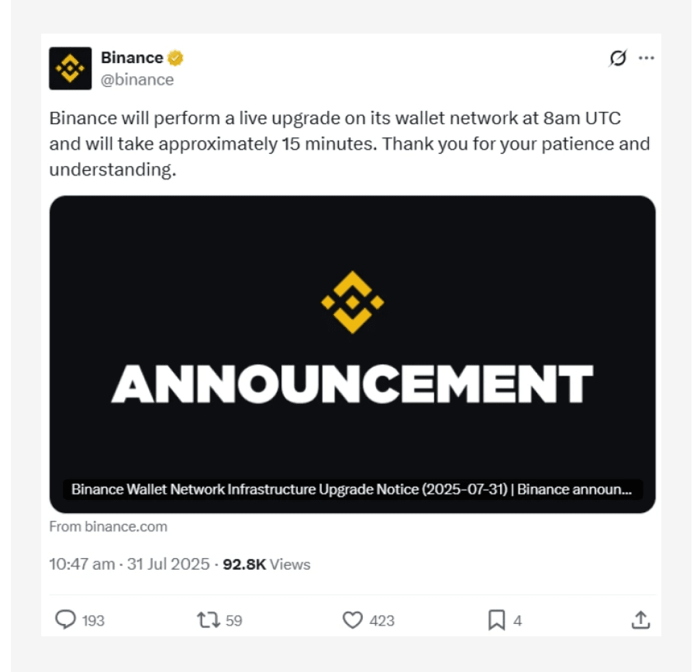 Binance provádí živé vylepšení své peněženky dnes (31. července), které by mělo trvat asi 15 minut. Během této doby budou všechny vklady a výběry pozastaveny napříč všemi sítěmi - takže se nebojte, pokud se na chvíli vše ztiší.
