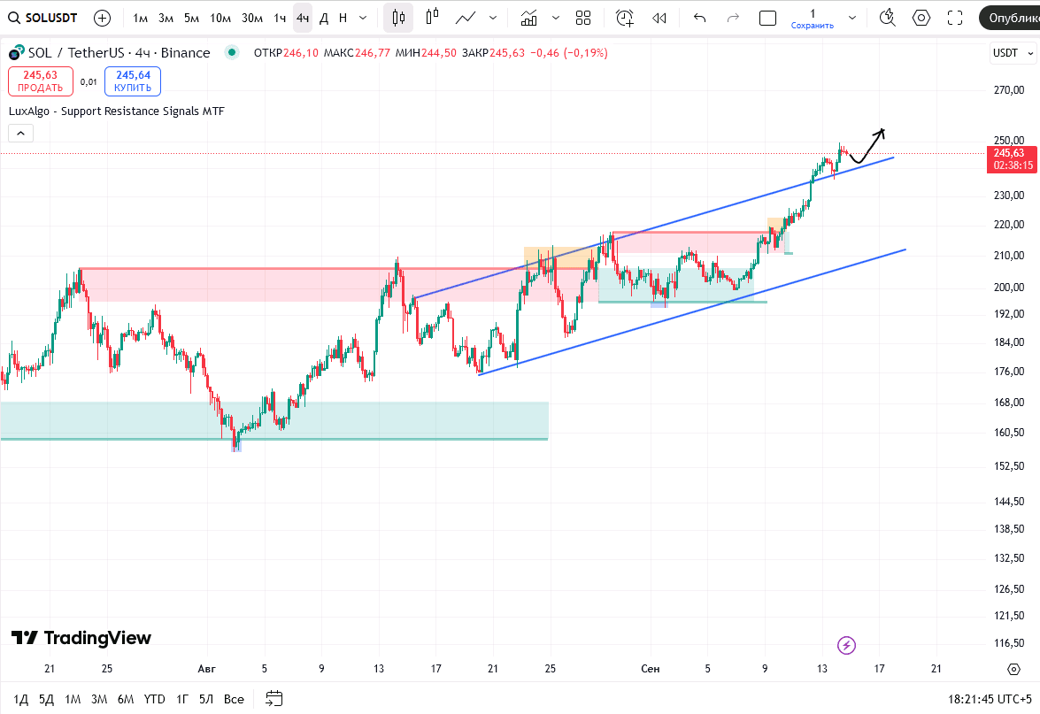 Z technického hlediska se Solana jeví velmi sebejistě. Obchoduje se na úrovni $247.82 a její tržní kapitalizace přesahuje $134 miliard. Graf ukazuje vzestupný kanál, v němž cena neustále vytváří vyšší minima.