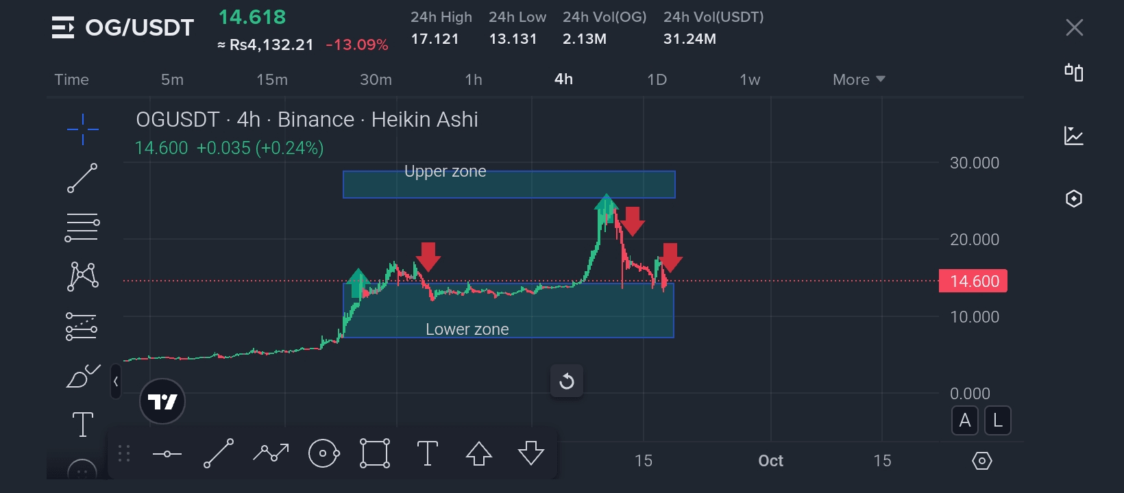 V tuto chvíli se OG/USDT obchoduje kolem 14,60 USD po silném odmítnutí z horní zóny 📉. Cena se prudce snížila z rozsahu 17–18 USD, kde jsme viděli několik svícnů odmítnutí, zvýrazněných červenými šipkami v grafu. To potvrzuje, že horní zóna funguje jako silná rezistence.
