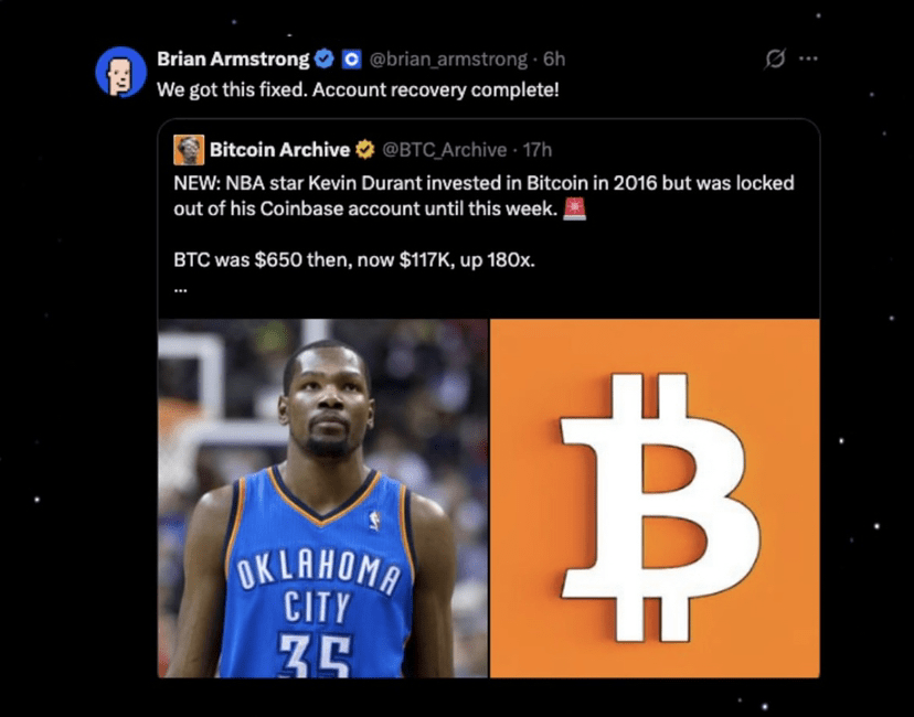 Téměř devět let zůstaly mince nedotčené. Coinbase obnovil jejich účet. Durant konečně získal zpět svůj Bitcoin - dlouho ztracená investice se vrátila jako miliony.